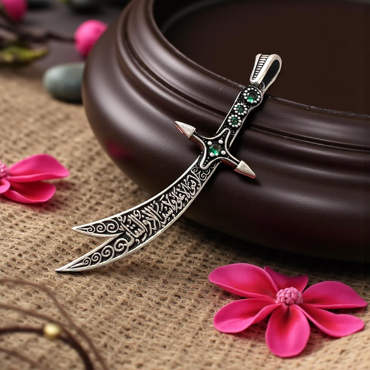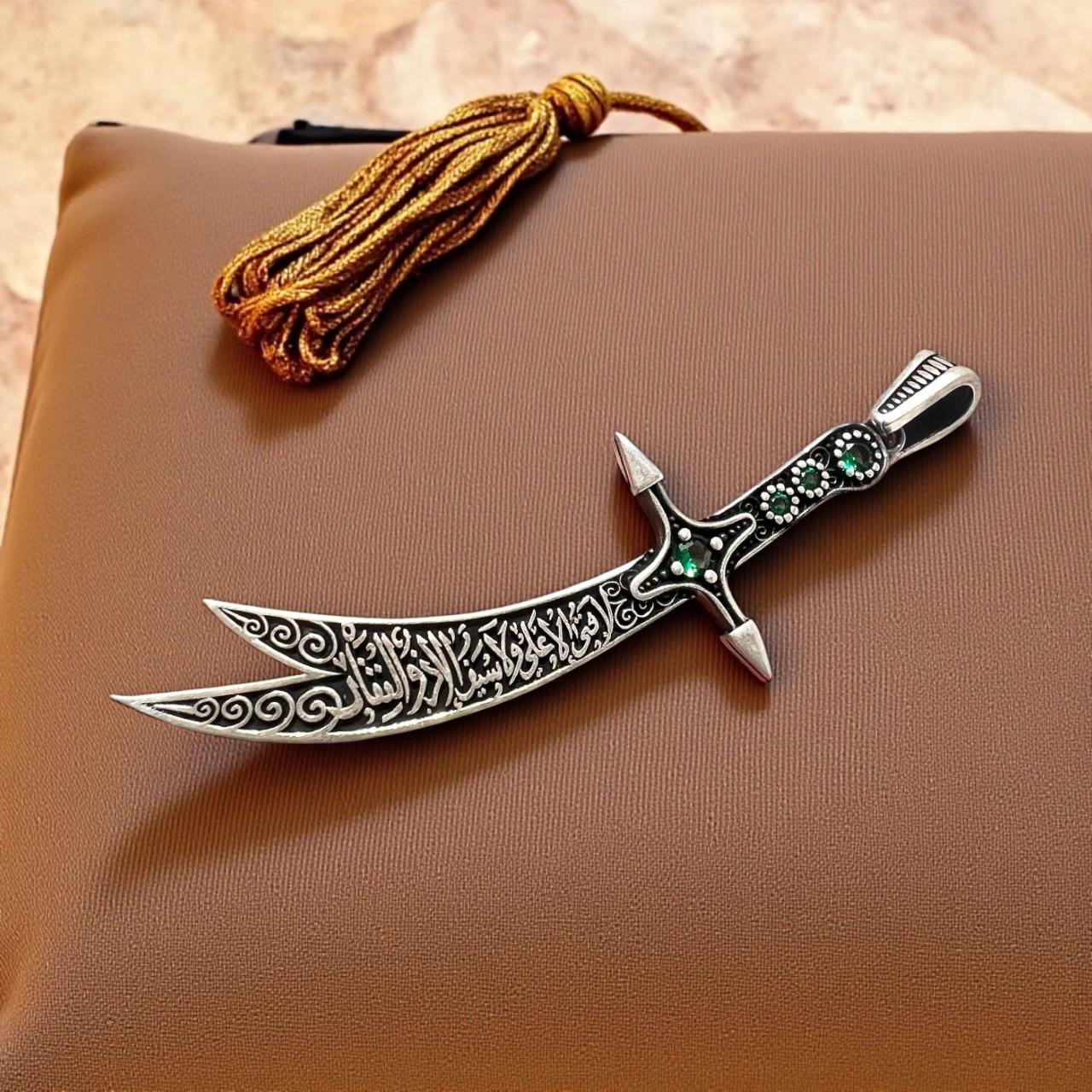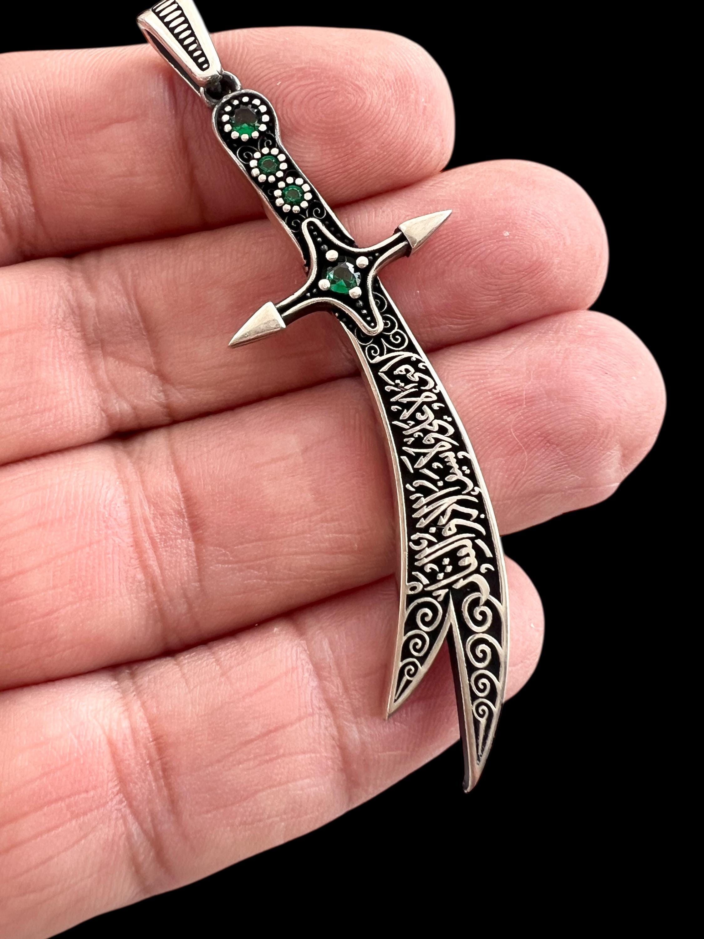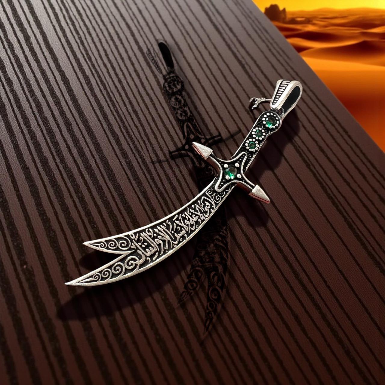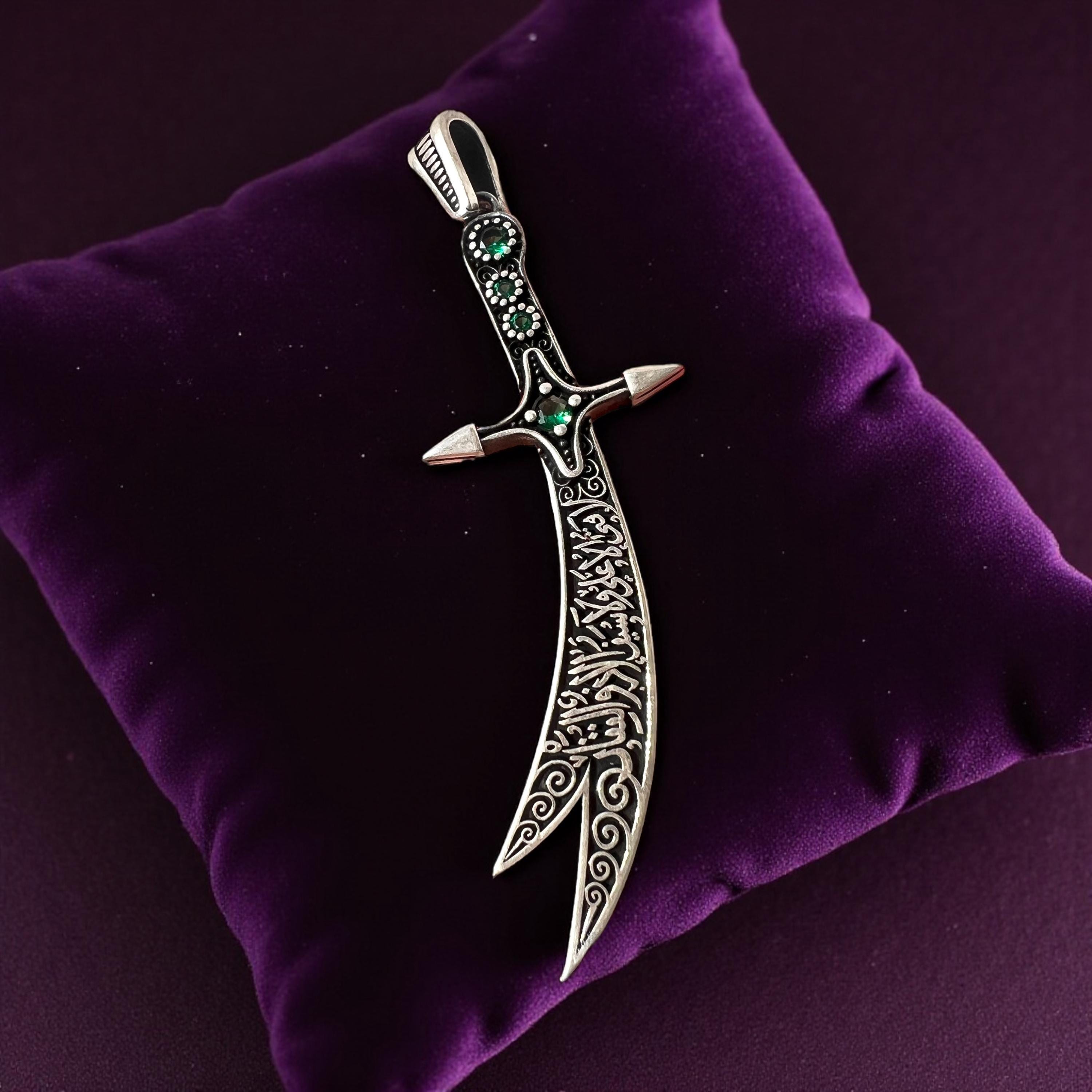 Honor the legacy of Imam Ali (a.s.) with this bold and meaningful Zulfiqar sword necklace, crafted from 925K sterling silver and set with a radiant green zircon.