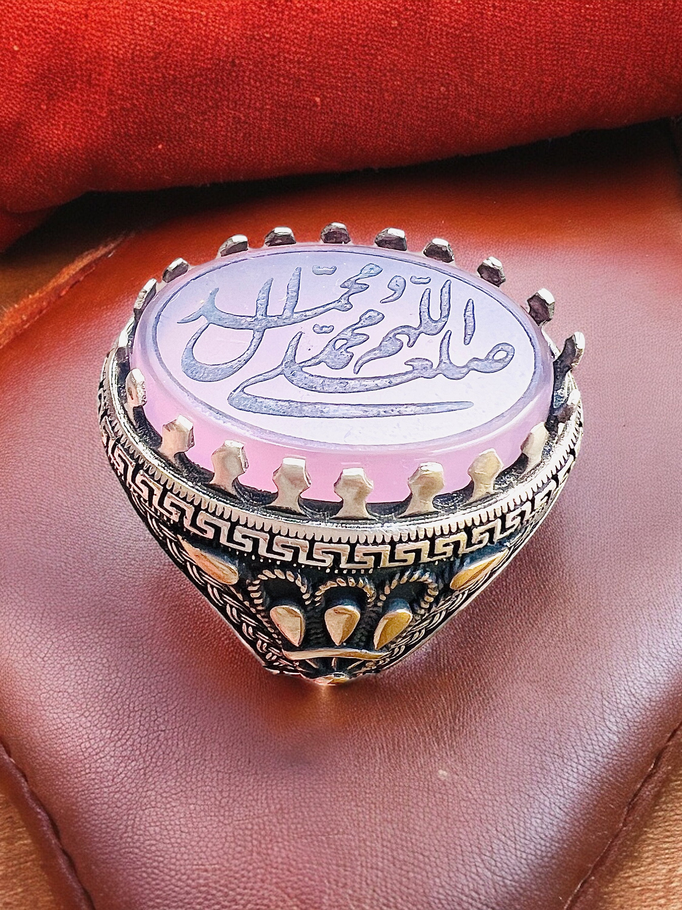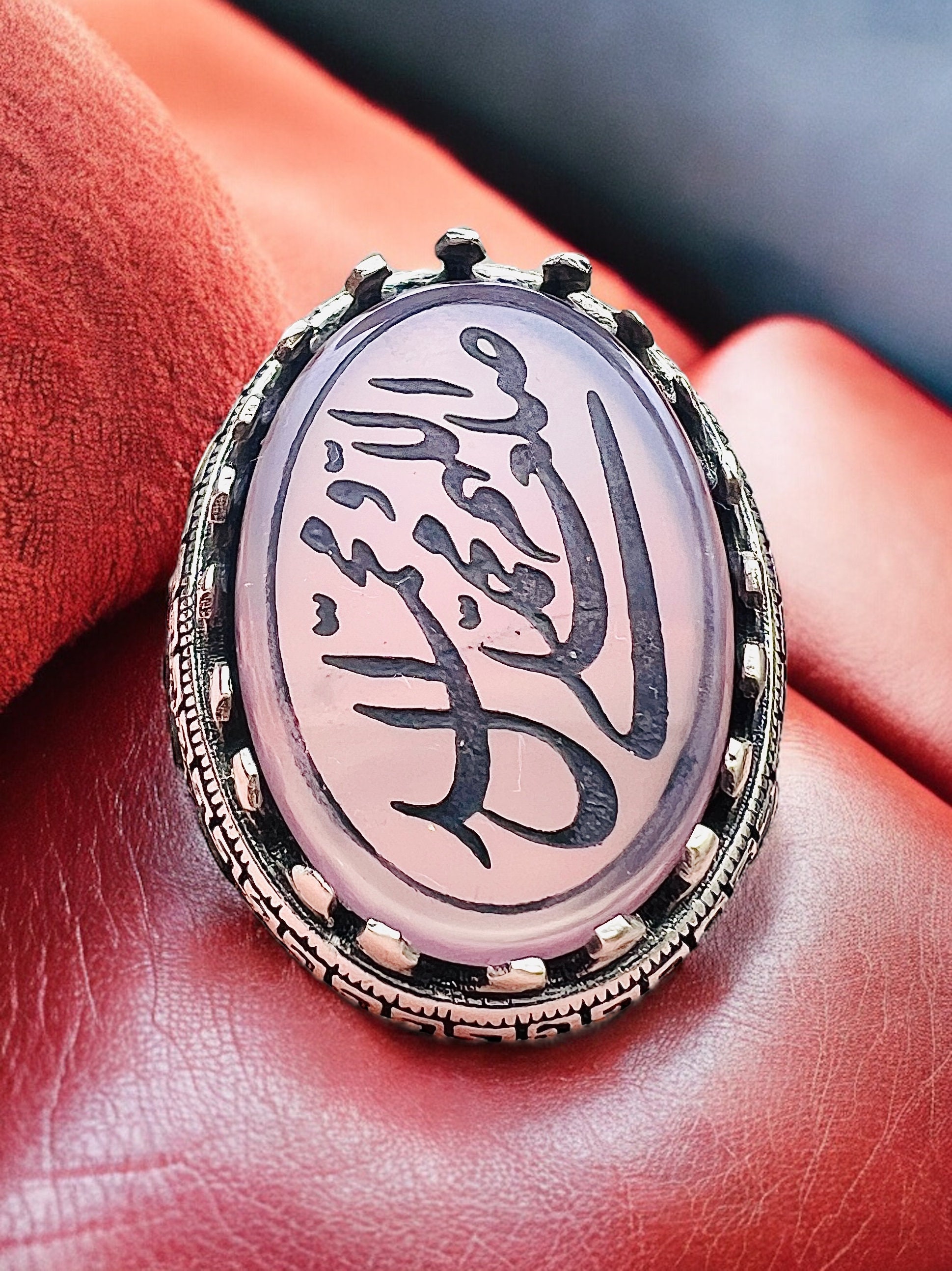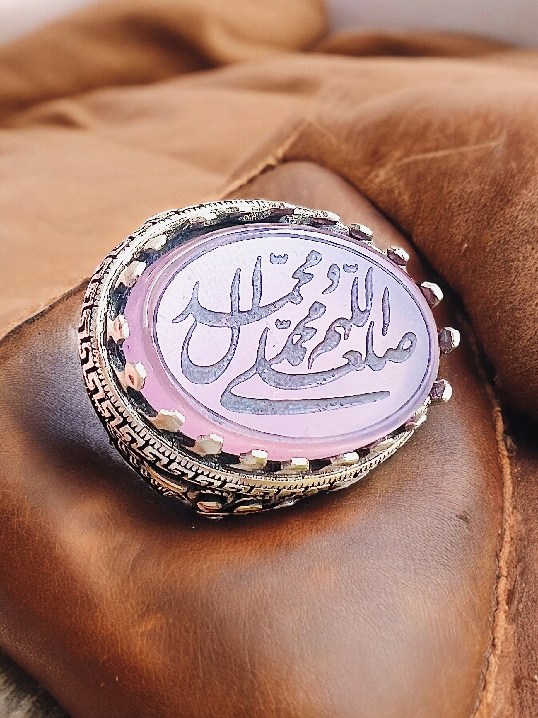 This elegant Islamic ring features the sacred Salawat calligraphy engraved beautifully on a natural rose agate stone (aqeeq) set in 925 sterling silver.