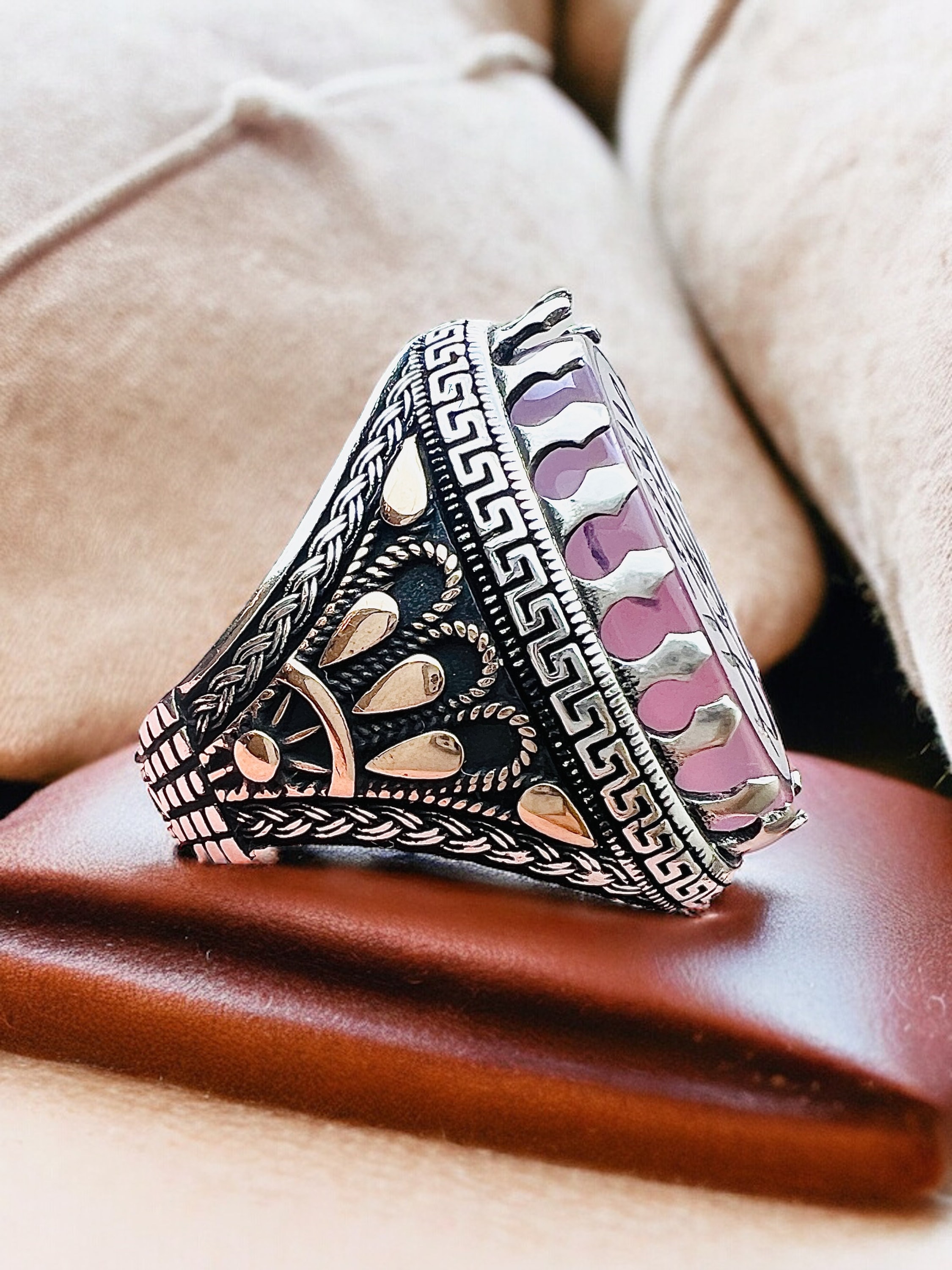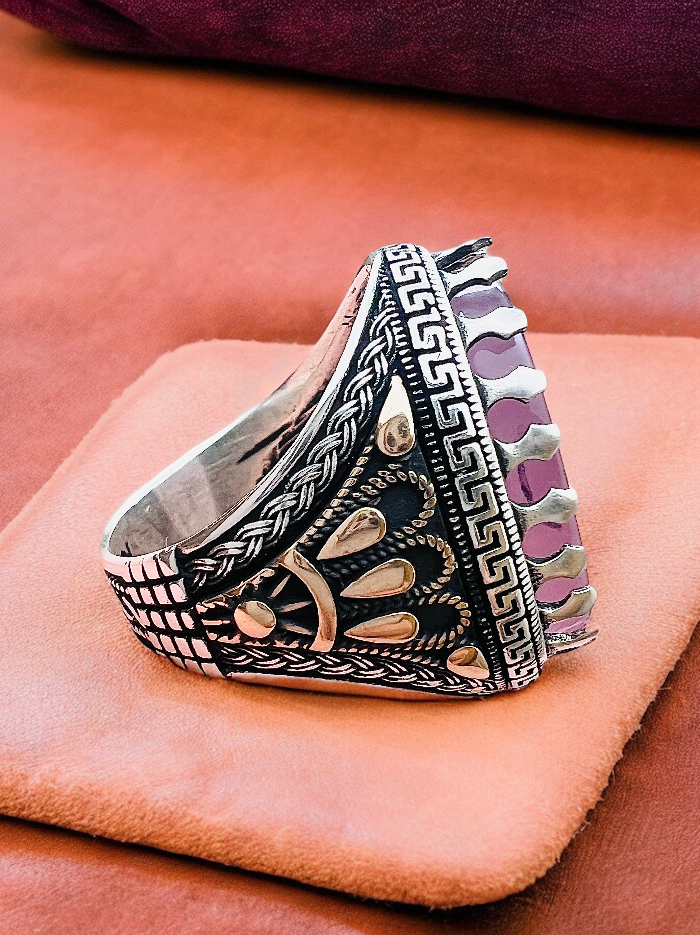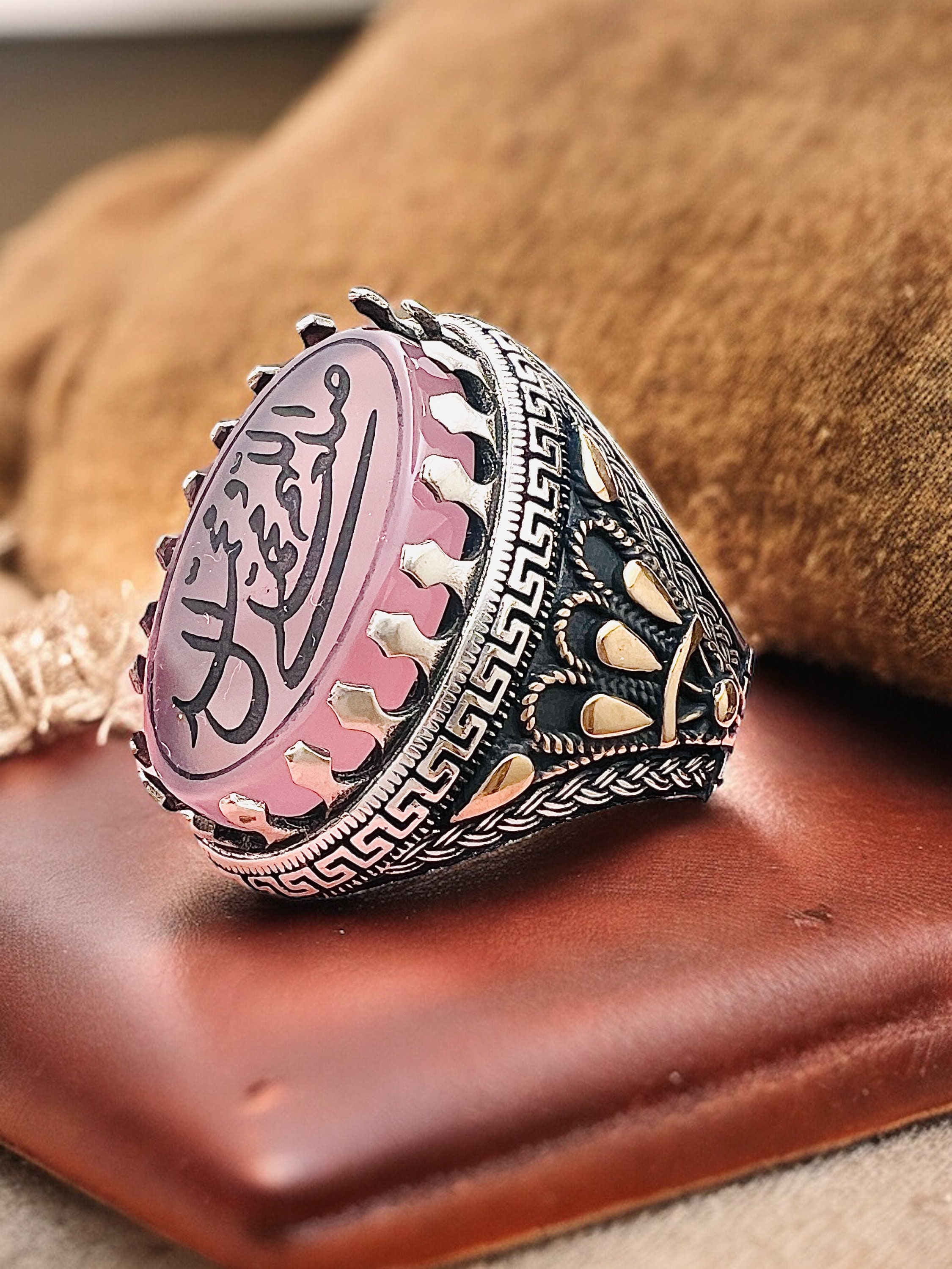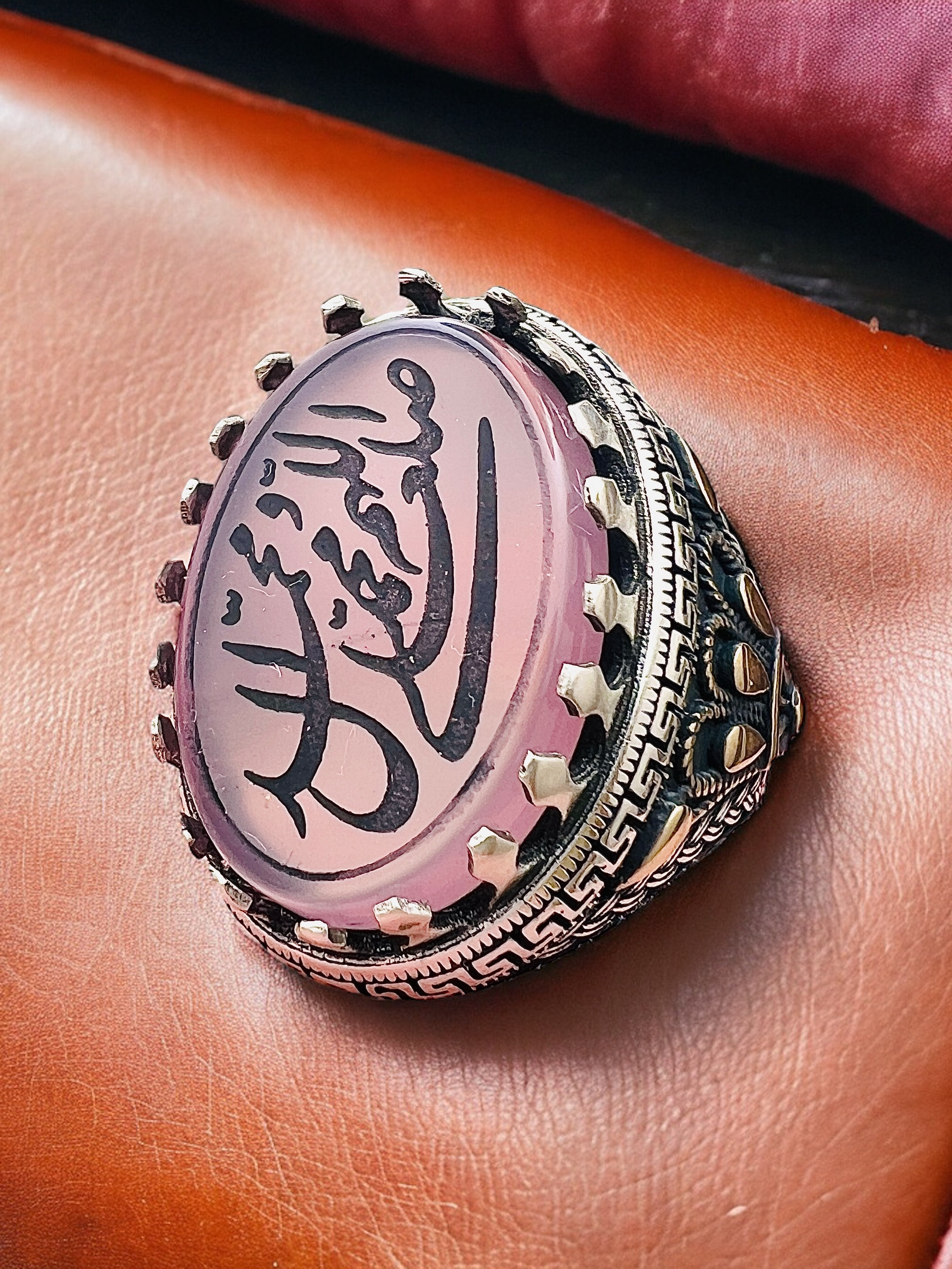 This elegant Islamic ring features the sacred Salawat calligraphy engraved beautifully on a natural rose agate stone (aqeeq) set in 925 sterling silver.