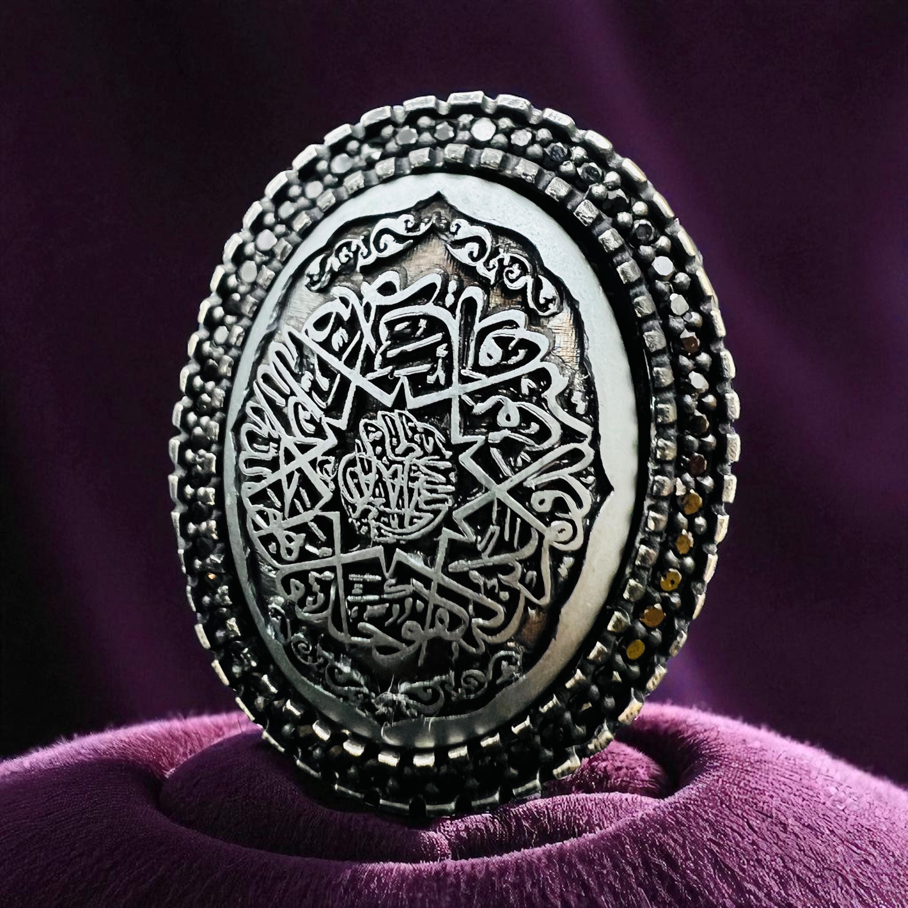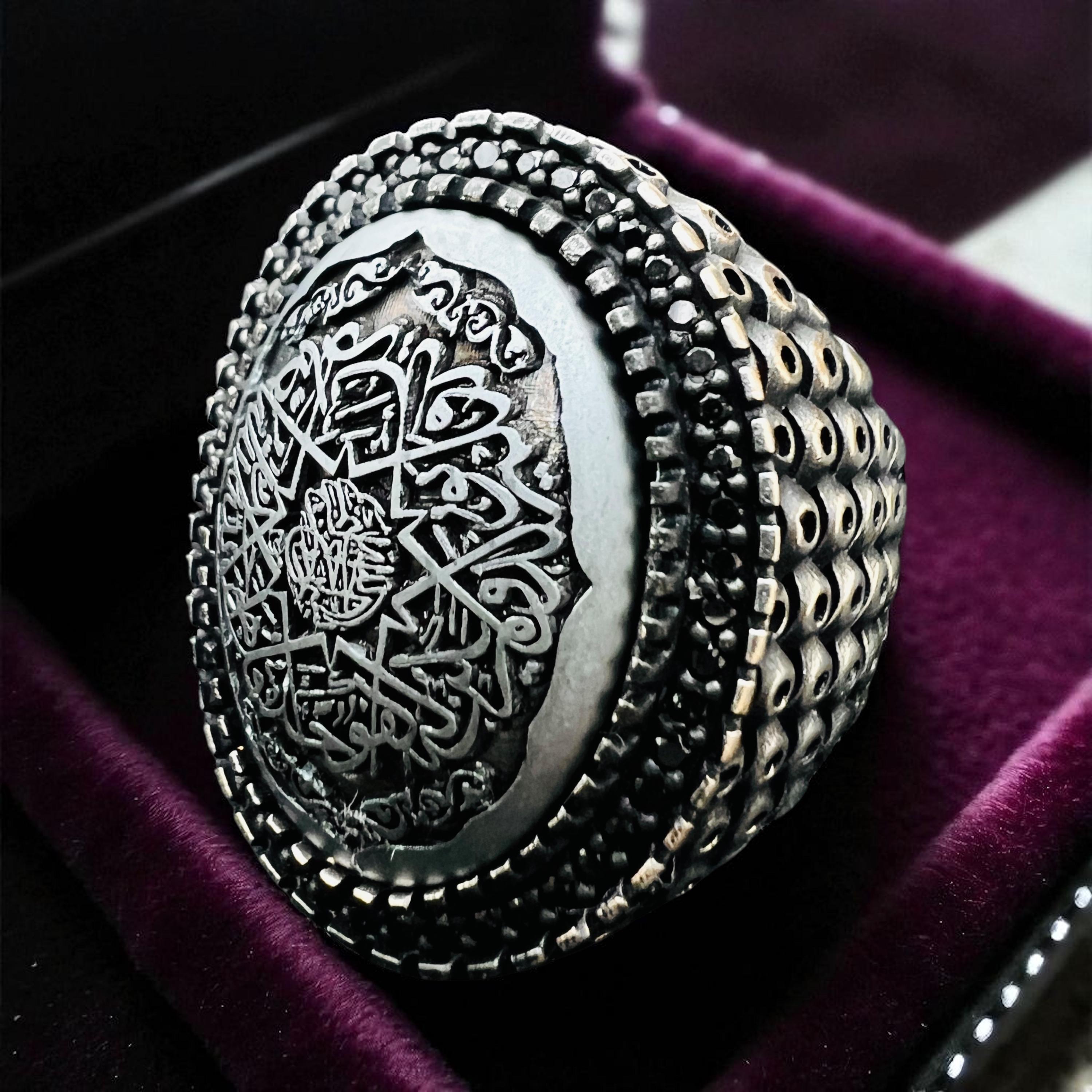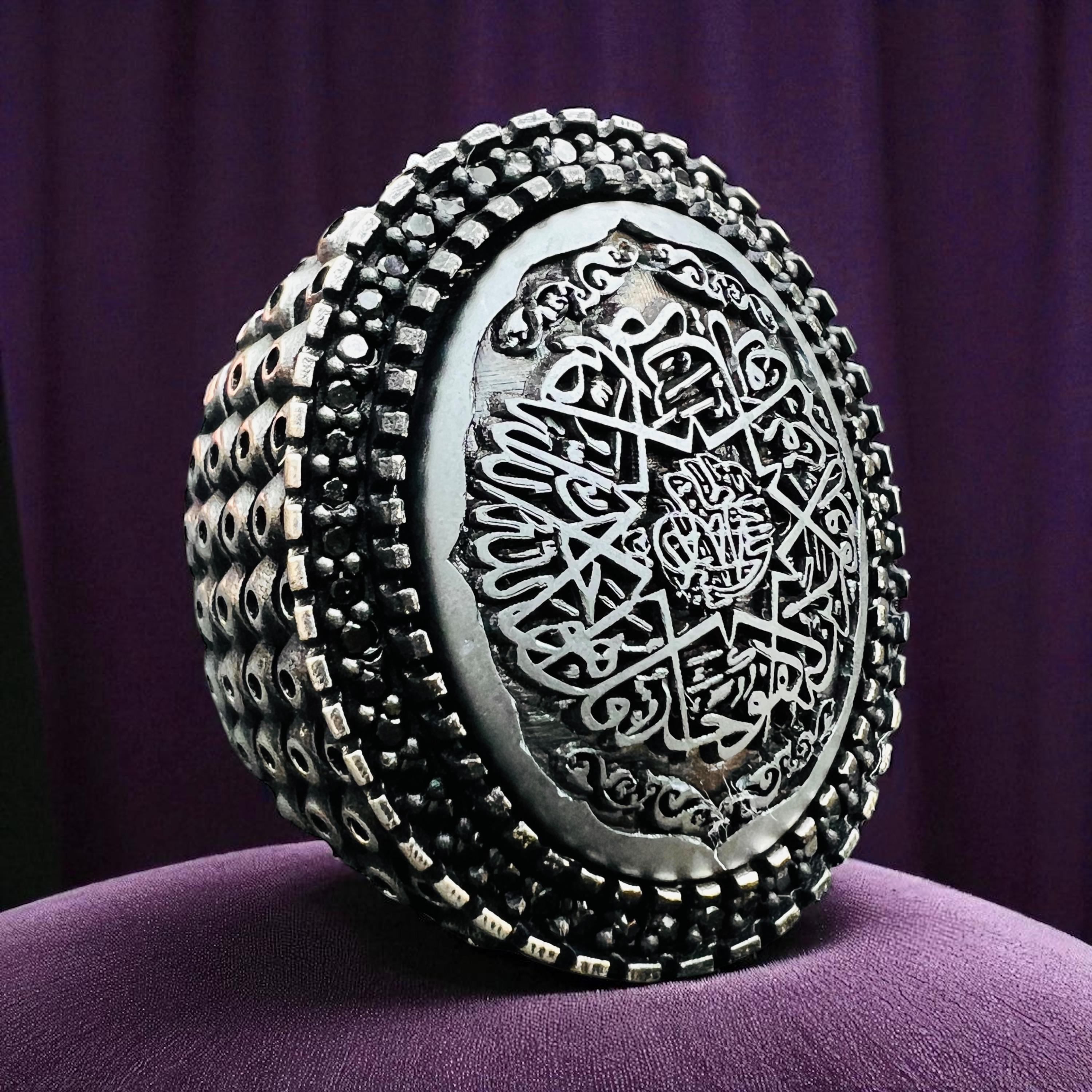 Embrace the spiritual power of this Islamic Hadid Sini ring, featuring the full engraving of Surah Al-Tawhid (Ikhlas) on a natural Hadid Sini (iron stone), set in solid 925 sterling silver.