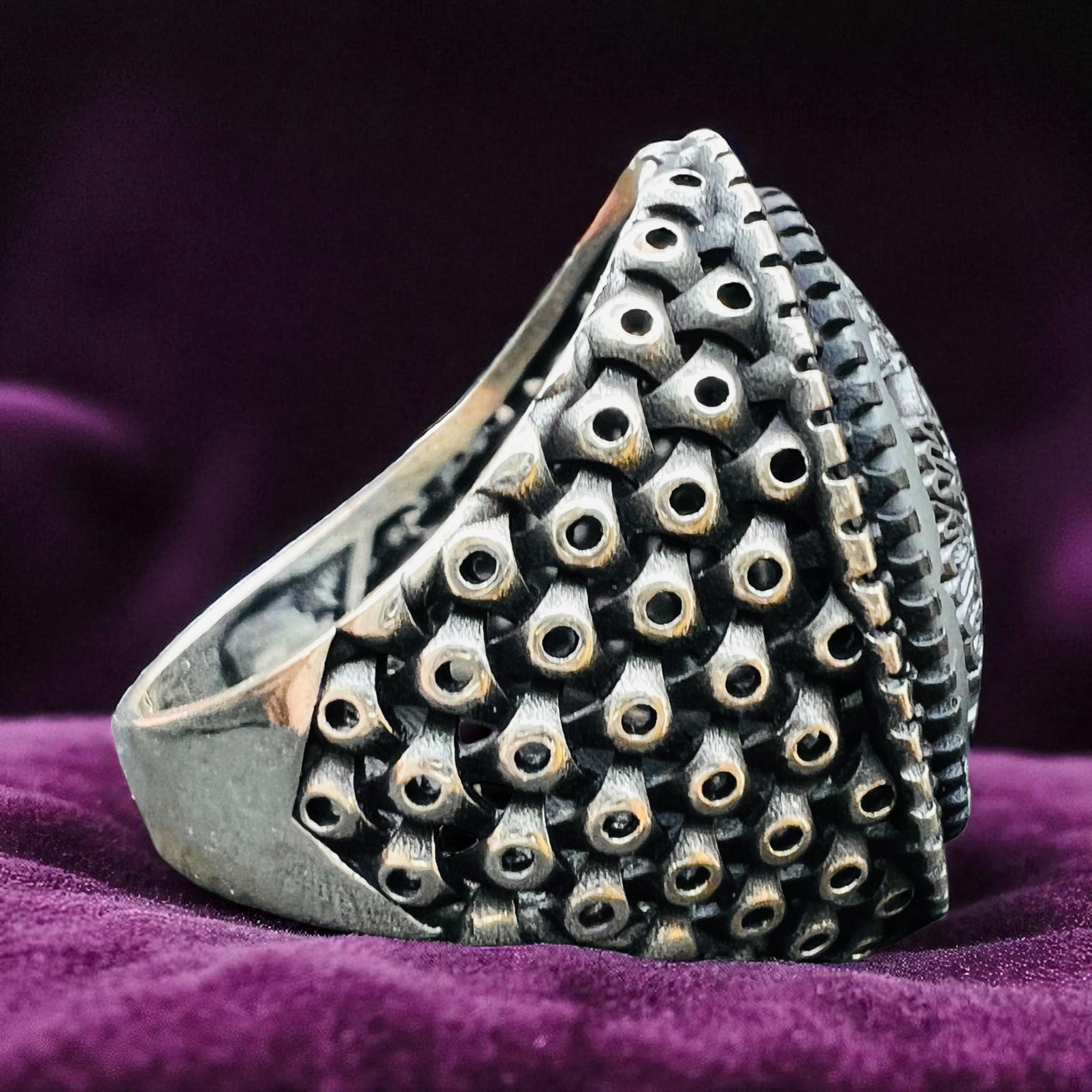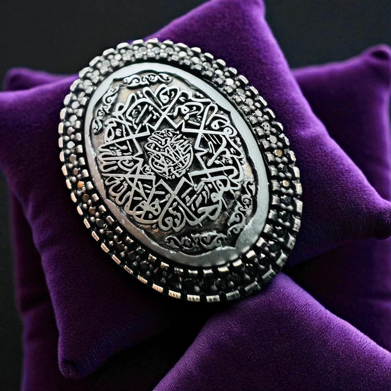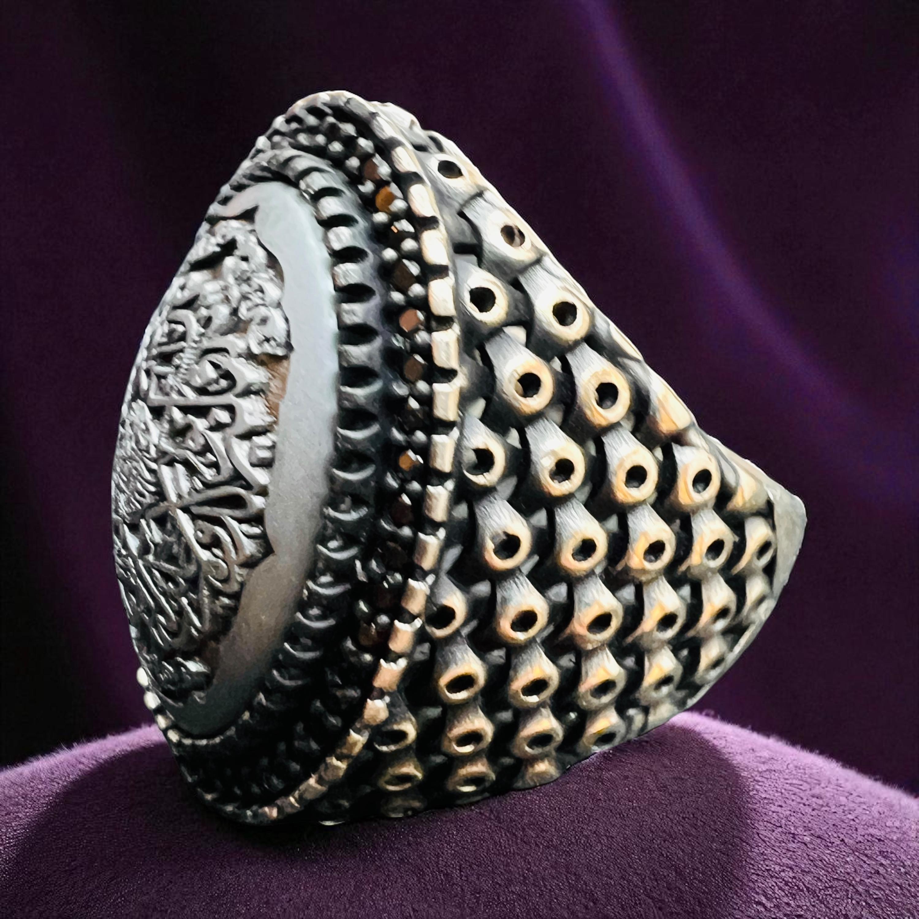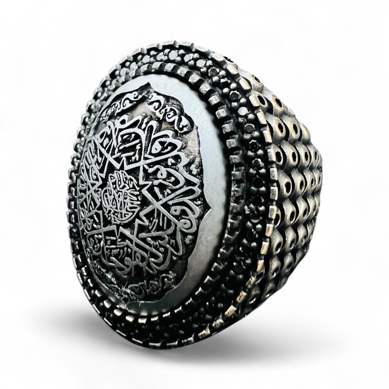 Embrace the spiritual power of this Islamic Hadid Sini ring, featuring the full engraving of Surah Al-Tawhid (Ikhlas) on a natural Hadid Sini (iron stone), set in solid 925 sterling silver.