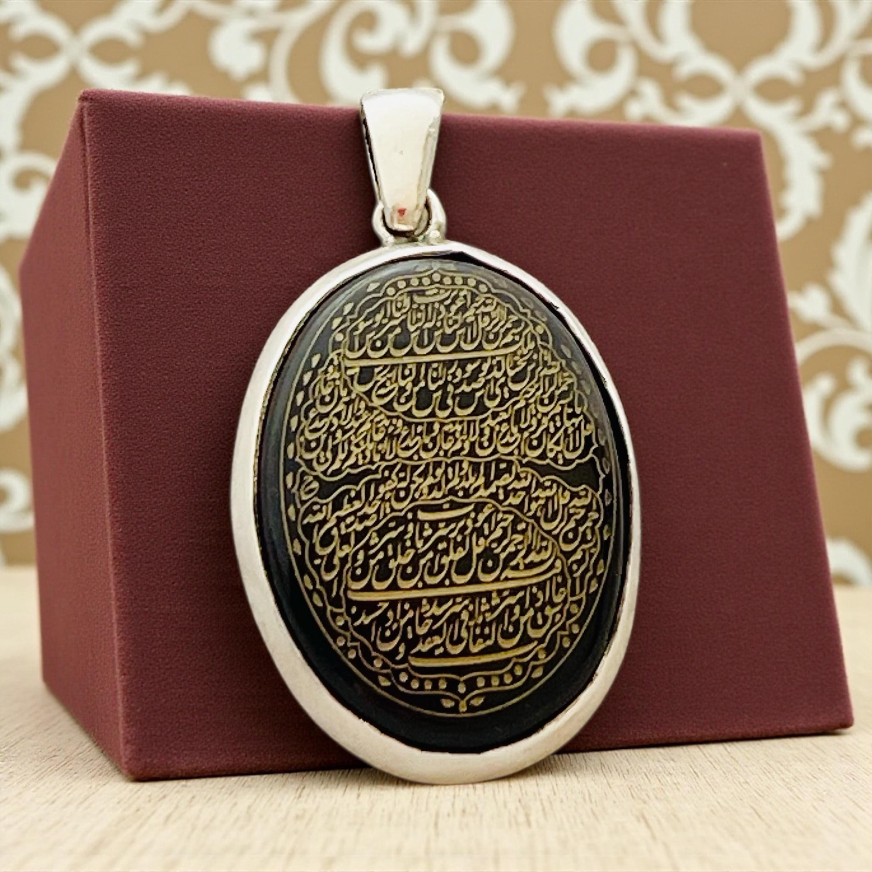 Engraved with four powerful Quranic verses, including سور قول, this pendant serves as a symbol of divine blessings, protection, and increased sustenance (رزق). Perfect for daily wear or special occasions, it blends rich Shia Islamic heritage with elegant artistry.