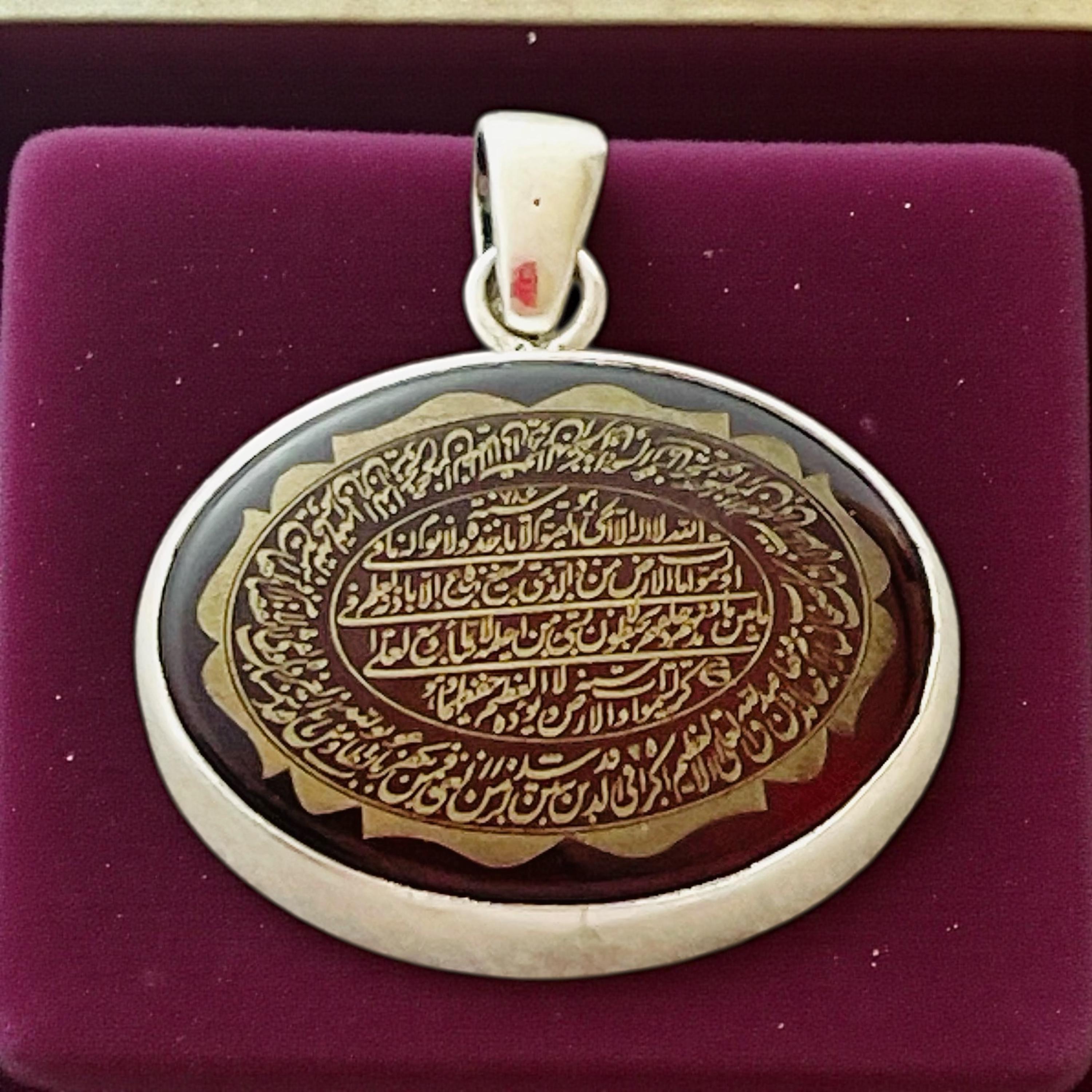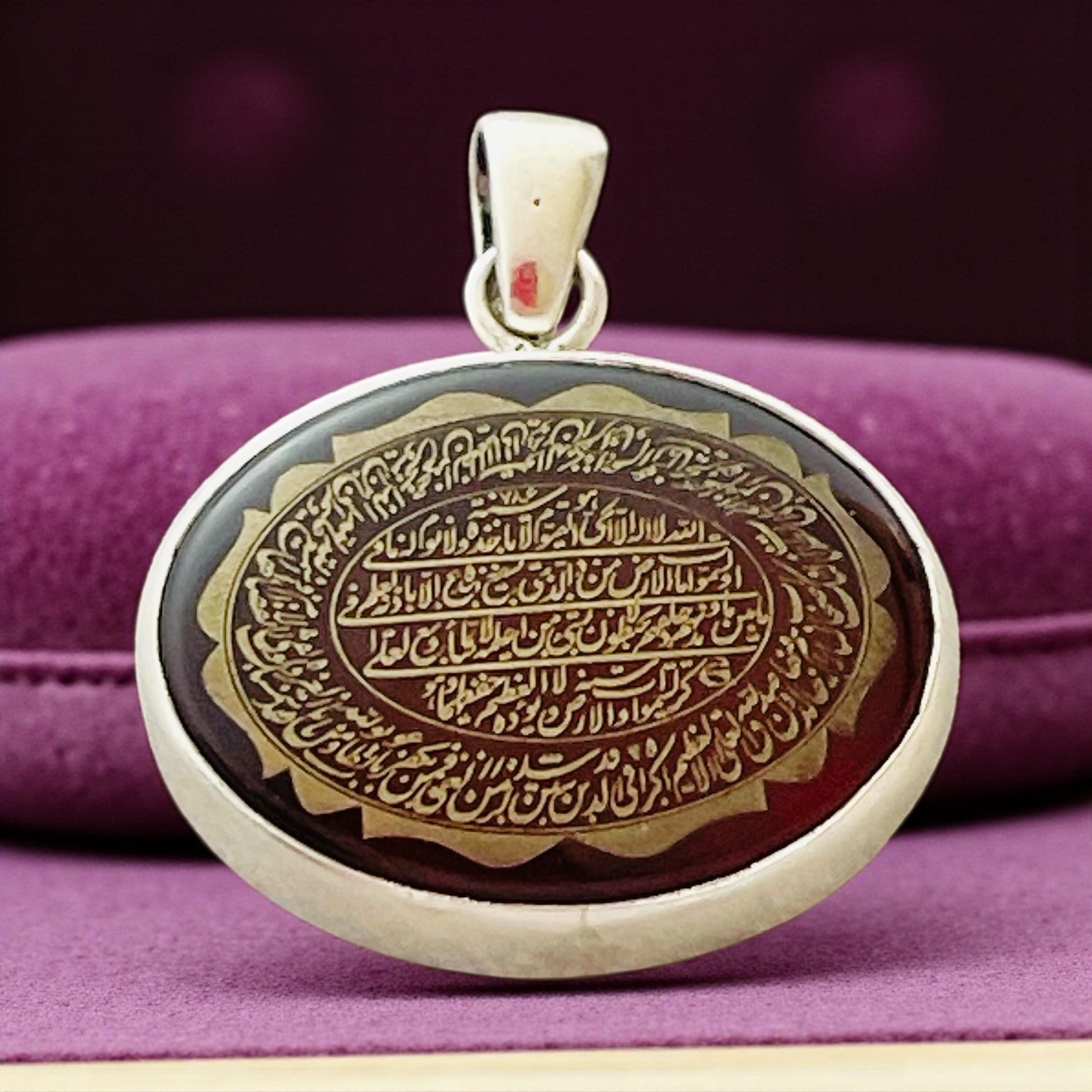 Carry the blessings and protection of Ayat al-Kursi with you wherever you go. This elegant pendant features a natural dark agate stone set in 925 sterling silver, intricately engraved with the sacred verse from the Quran.