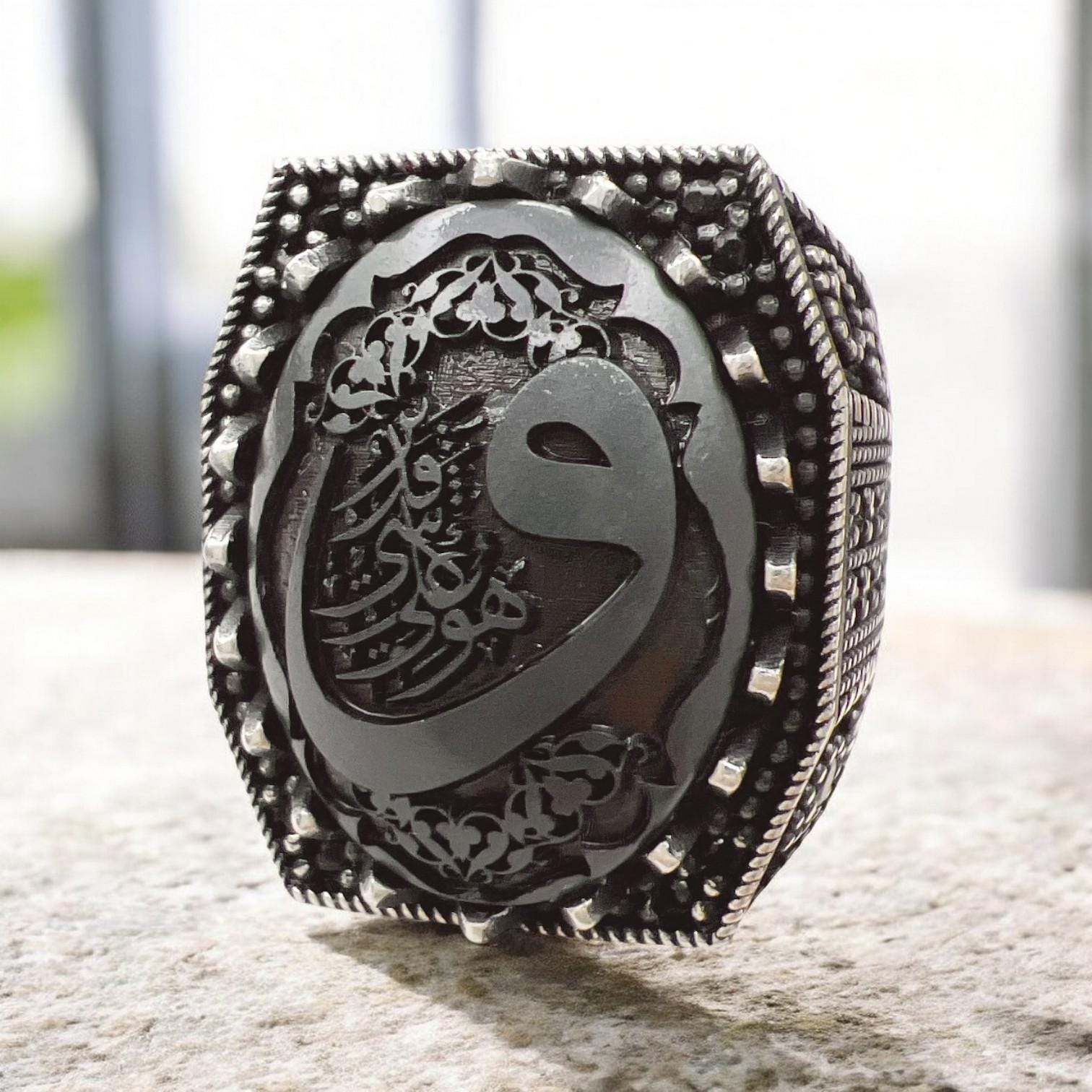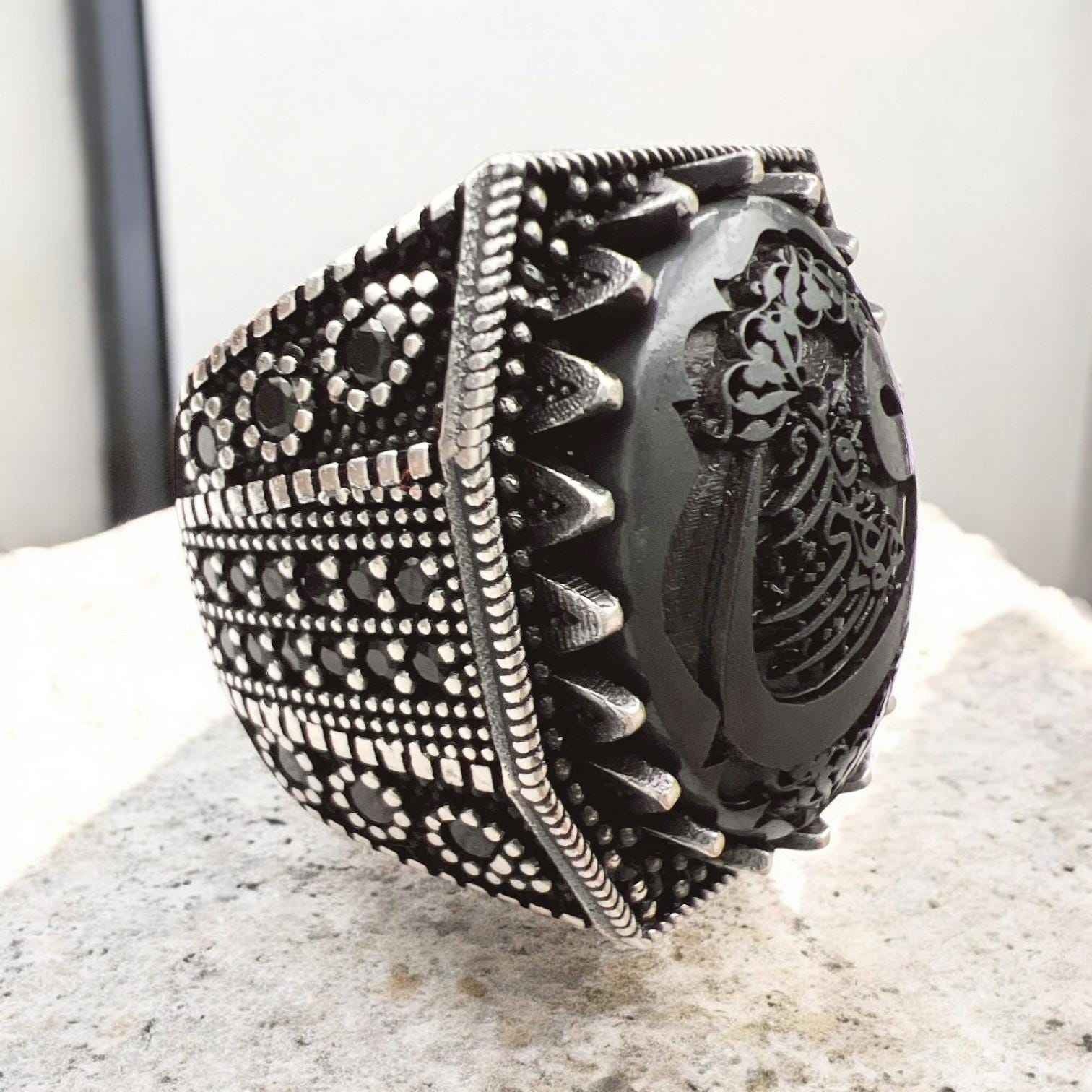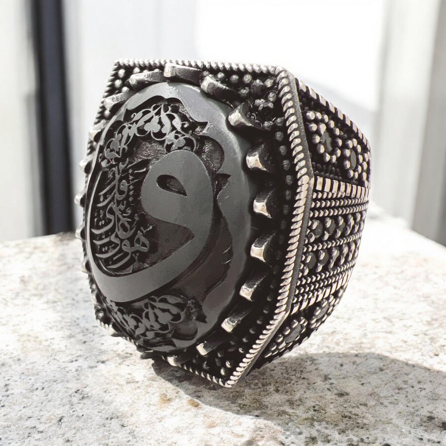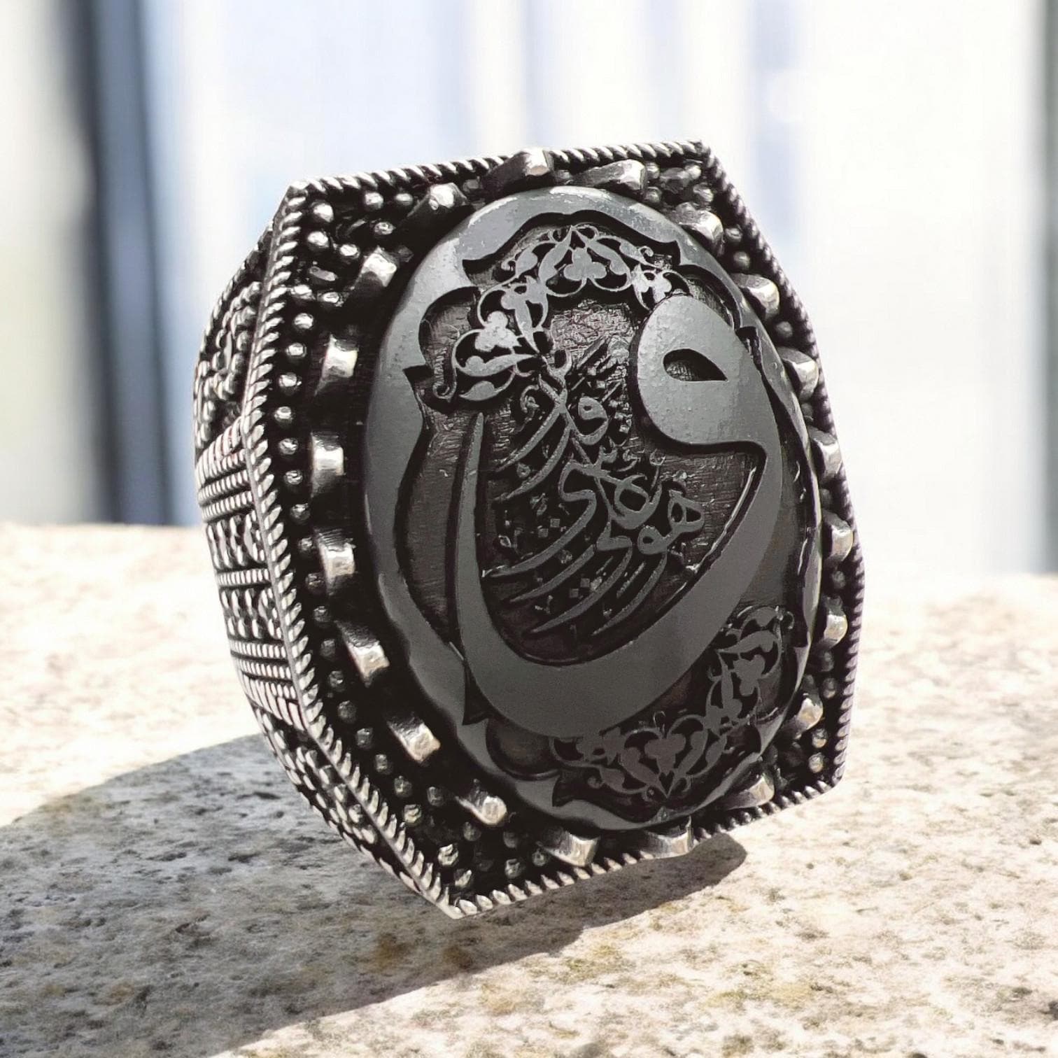 Handmade by skilled artisans, this ring features a polished 15×20 mm stone set in a durable solid silver bezel. The detailed Arabic engraving adds meaning, elegance, and a timeless spiritual touch.